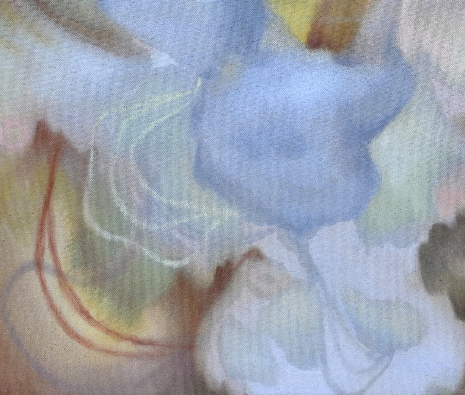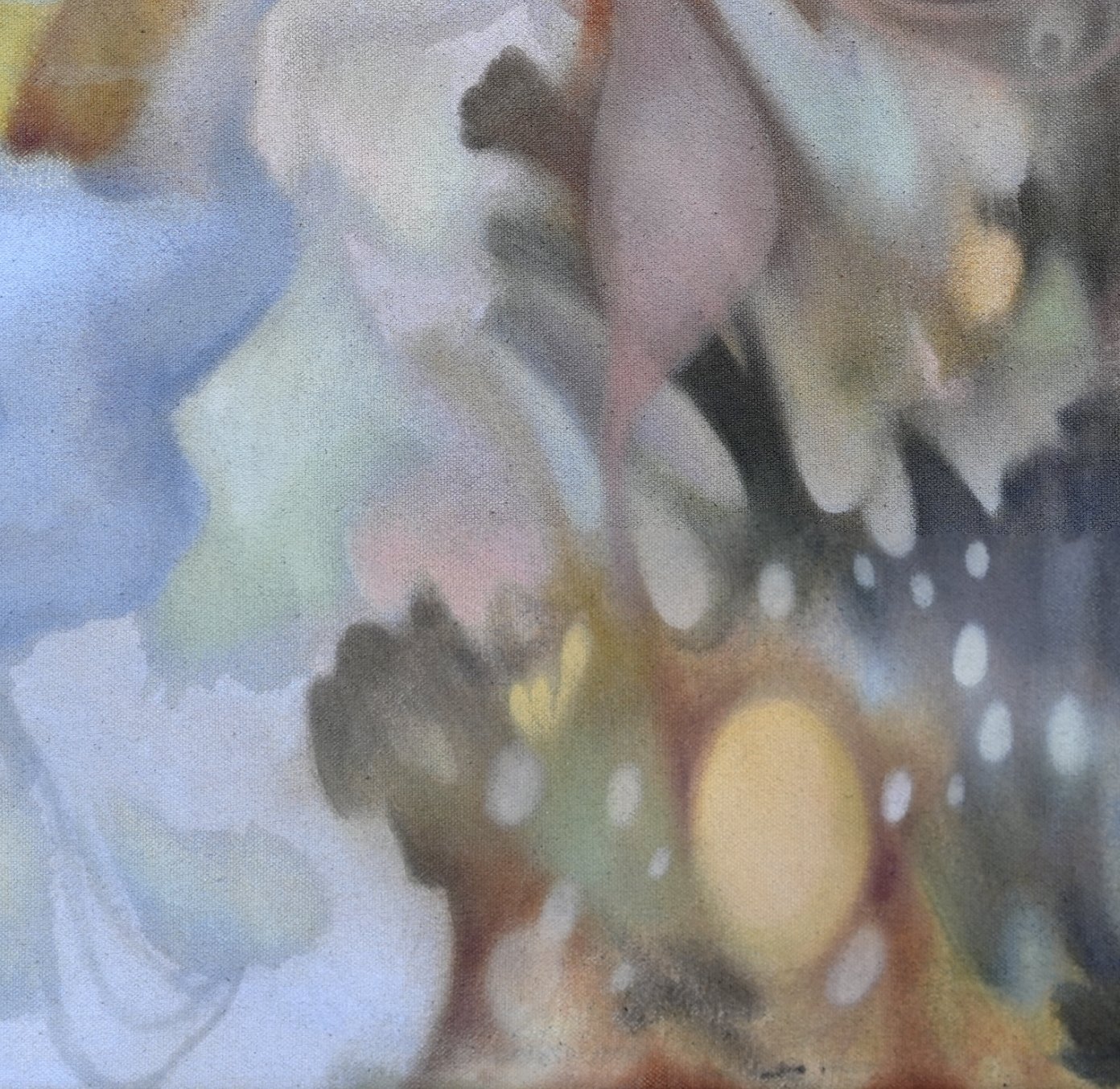 Painted on raw canvas, the substrate of this work was developed with mineral pigment. It was my first time using this type of paint, which usually requires a binder. The texture of the pigment is gritty, grainy, and almost like soil. As such, the early stages of this painting unfolded slowly, organically, and with lots of warm, earth-tones.