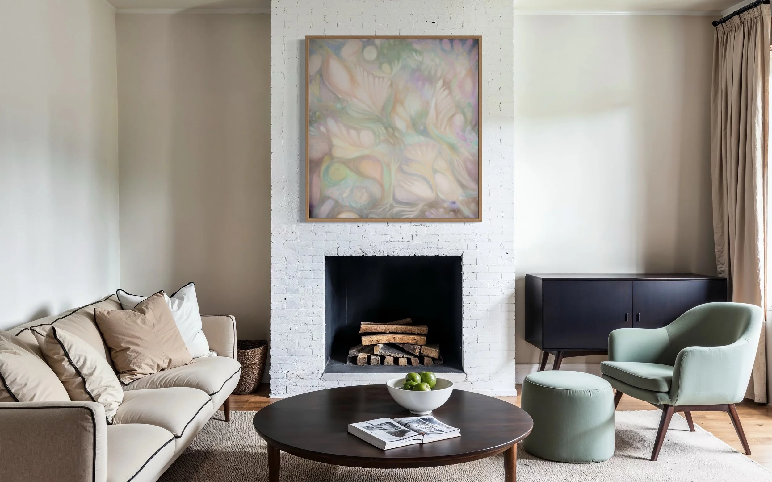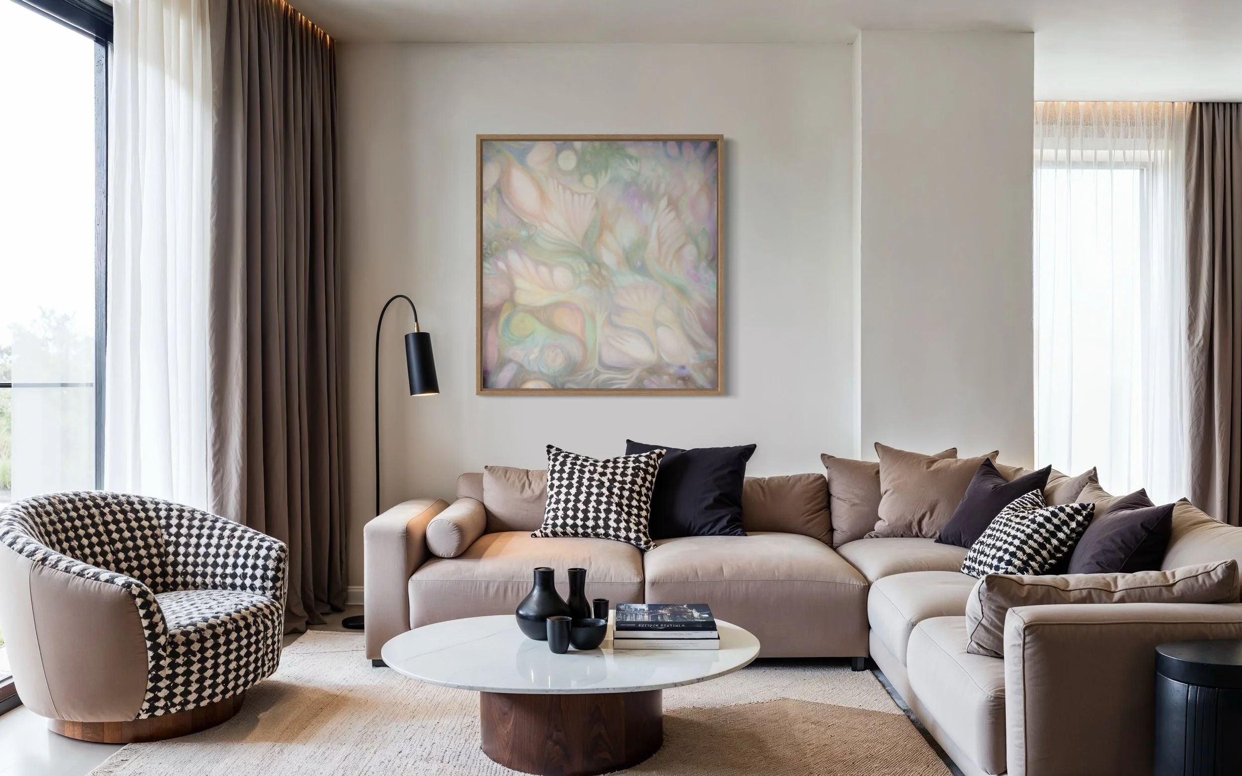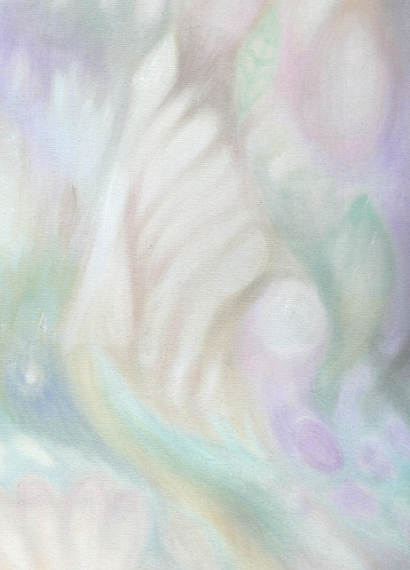 A wall-sized abstract painting in oil on raw canvas. Soft yet dynamic with fluid forms evoking leaves, flowers, stars, and roots.