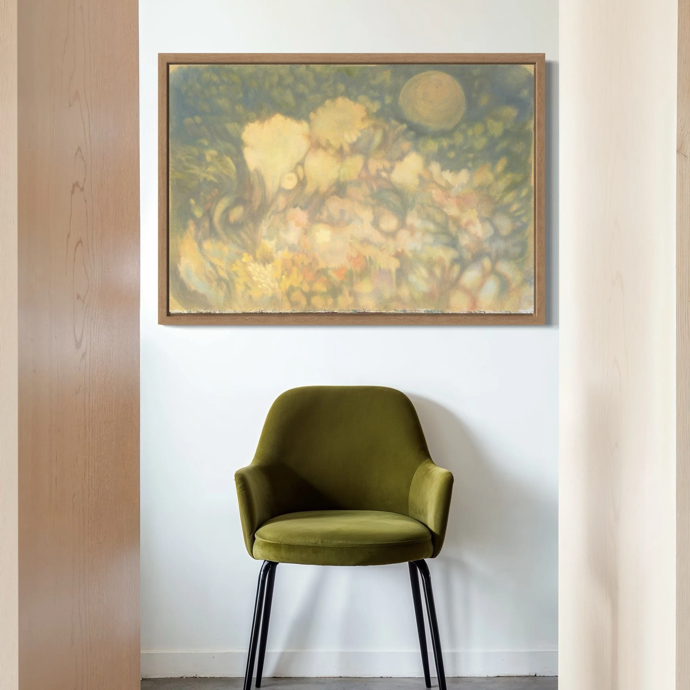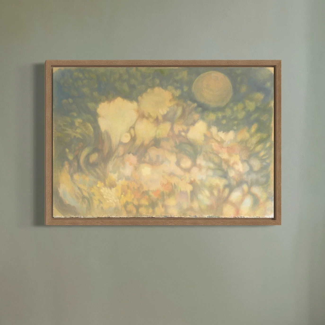 Painted on raw, un-stretched canvas, the medium dictated the direction in a way. Raw canvas absorbs paint quickly, making each stroke resonate at a quieter frequency. The dominant floral forms emerged first and were quickly echoed by the smaller, supporting strokes that emanate from the lower foreground.
